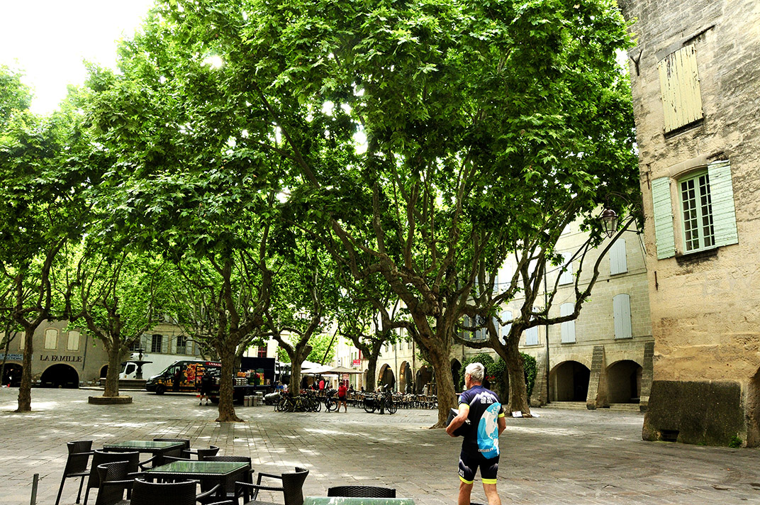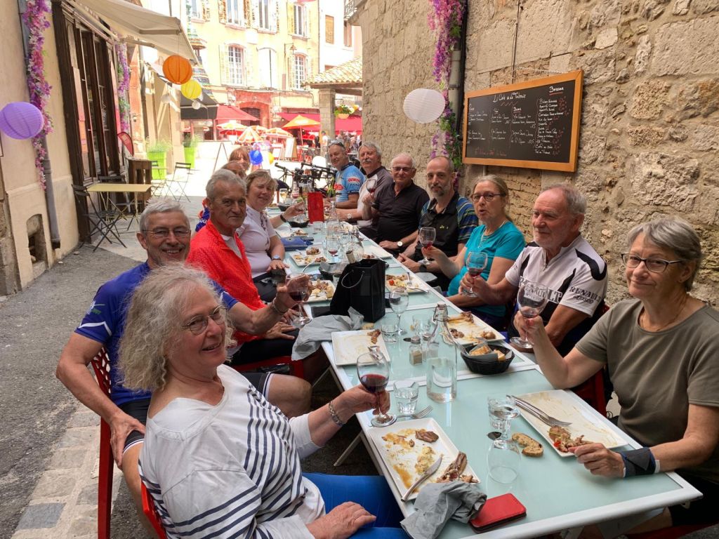 Si j’étais Honoré de Balzac, je dirais maintenant : « Imaginez une ruelle étroite… » mais, vu que les seuls lecteurs de cette chronique ont été les acteurs de cette scène (en même temps que cène), je dirais comme Charles Aznavour : « T’en souvient-il ? » T’en souvient-il de cette longue table dressée en pleine rue, à l’ombre de murs centenaires, du sourire de cette restauratrice devenue vite notre complice, acceptant nos photos et en prenant pour nous, servant les apéritifs en partageant nos éclats de rire… Ben quoi ? C’est pas parce qu’on pédale qu’on n’est pas amoureux du beau (et des belles), qu’on n’apprécie pas la générosité (et le sens commercial) du voisin, fabricant de nougat artisanal, qui nous prêta le couloir de son échoppe pour y garer quelques vélos. Comme le chasseur préhistorique qui demande poliment à son gibier la permission de l’abattre, notre hôtesse savait donner à ses clients, affection, complicité et respect (même devant les bizarreries les plus inattendues) avant de leur présenter l’addition. Je ne me souviens plus du menu mais je me souviens que c’était vachement bon, original, et bien présenté, et que l’ombre de cette petite rue ruelle était douce et caressante.
