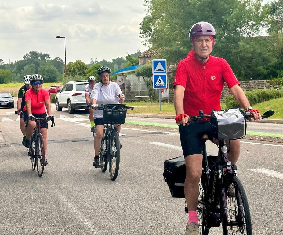 La descente du Gard s’avéra donc une sorte de fake news, une bulle qui finalement éclate devant l’évidence de la réalité. Cette « petite route » sur la rive opposée à la route principale était en fait tout sauf tranquille : un coup, je monte, un coup, je descends, un coup, j’escalade, un coup, je plonge. Je ne parle même pas des ponts submersibles, étroits, sans protection, que t’oses même pas regarder l’eau qui coule, claire, sur les cailloux ruisselants, tellement t’as la trouille de sortir de ta ligne, et tu fais ‘ouf’ silencieusement en arrivant de l’autre côté. Tu ne remarques même pas que ça rime avec plouf et t’as même pas le temps de changer de braquet que déjà il faut remonter l’autre rive comme un malade, avec la sueur qui te colle le sac à dos sur tes reins trempés. Mais tu souris quand même parce qu’elle est belle cette vallée, et tu ne remarques même pas que Thierry, qui a de l’expérience et de la jugeotte, n'a pas de sac à dos qui sent la sueur, lui, juste une sacoche fixée au guidon avec la carte du parcours posée dessus et le téléphone portable pour compter les kms, mesurer la dénivelée et vérifier que le parcours est suivi sans la moindre erreur. Et tu ne remarques même pas que les vélos électriques (trois cette année, une inflation record dans les annales d’IVV) se moquent de la dénivelée et sourient au ciel bleu, au vent frais et à l’effort des collègues musculaires qu’ils encouragent sans arrière-pensée. Merci Bernard, merci Nadine, merci Sylvie. Nous avons passé un bon moment.